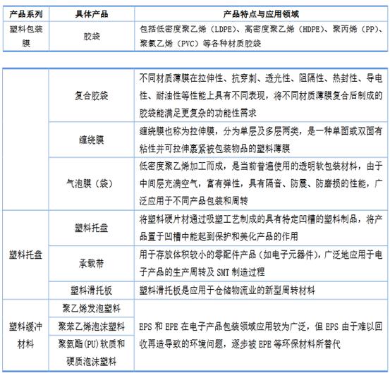 从包材类别及应用领域划分,电子产品塑料包装材料主要包括塑料包装膜、塑料托盘和塑料缓冲材料三大系列产品: