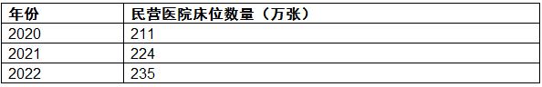 2020-2022年中国民营医疗床位数量从211万张上升到235万张。
