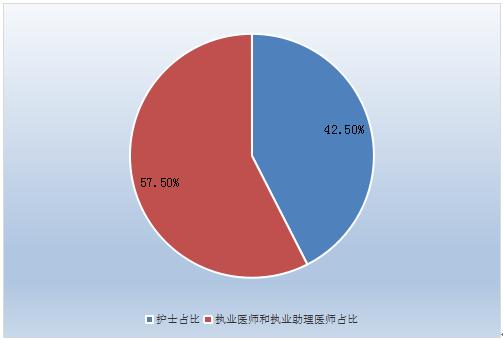 2022年民营医疗机构卫生人员构成中执业医师和执业助理医师占比57.5%,护士占比42.5%。