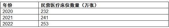 2020-2022年中国民营医疗床位数量从232万张上升到253万张。