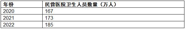 2020-2022年中国民营医院卫生人员数量从167万人上升到185万人。