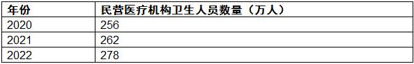 2020-2022年中国民营医疗机构卫生人员数量从256万人上升到278万人。