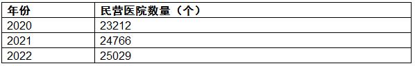 2020-2022年中国民营医院数量从23212个上升到25029个。