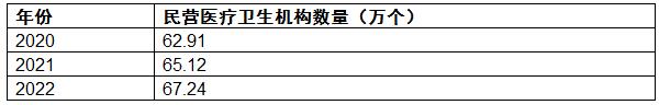 2020-2022年中国民营医疗卫生机构数量从62.91万个上升到67.24万个。
