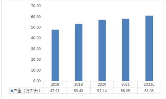 图表:2018-2022年国内酱香型白酒产量规模(单位:万千升)