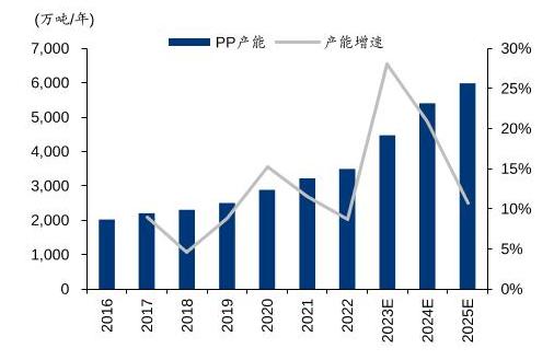 图表:中国聚丙烯(PP)产能情况(2016-2025E)