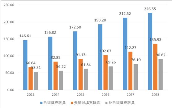 图表:2023-2028年填充毛绒玩具细分产品市场规模(亿元)
