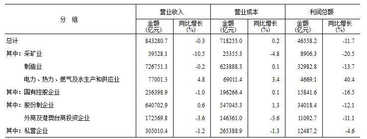1—8月份,采矿业实现利润总额8906.3亿元,同比下降20.5%;制造业实现利润总额32982.8亿元,下降13.7%;电力、热力、燃气及水生产和供应业实现利润总额4669.1亿元,增长40.4%。