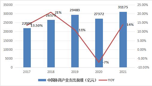 中国体育产业是近年来快速发展的一个重要经济领域,涵盖了体育赛事、体育培训、体育用品和装备制造、体育娱乐、体育旅游等多个领域。其中,2020年间受新冠疫情影响,我国体育产业总支出规模较2019年同比相比下降了7%,2021年期间,我国体育产业总支出规模有所恢复,截至2021年底,全国体育产业总支出规模达31175亿元,较2020年期间,同比增长了14%。