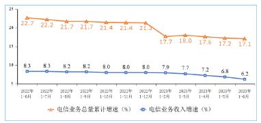 电信业务收入平稳增长,电信业务总量持续较好增势。上半年,电信业务收入累计完成8688亿元,同比增长6.2%。按照上年不变价计算的电信业务总量同比增长17.1%。