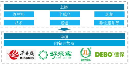 团餐指在一个时间周期内,某个相对固定的消费群体,在其所属或活动的场所内,通过谈判和招标等方式选定专业的第三方餐饮公司提供餐饮服务的就餐方式,主要服务对象是校园、机关、企事业单位等大型团体。团餐行业产业链较长,涉及的环节较多。产业链上游主要是供应商,包括提供原材料、餐饮服务及设备等商家;中游则是团餐运营企业,代表性企业有千喜鹤、健力源和德保膳食等,下游主要是学校、机关、企业等消费群体。