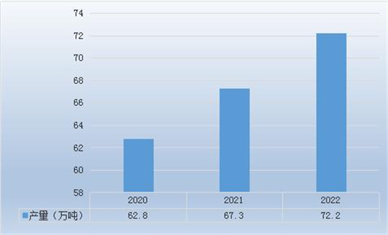 近年来,全球PETG市场产销稳定增长,2020年产量为62.8万吨,2022年PETG产量达到72.2万吨。
