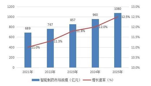 智能制药行业前景及现状如何?未来智能制药市场投资趋势怎么样?预计智能制药市场规模达到689亿元,增速为11%,至2025年智能制药行业市场规模增长超过千亿元,达到1080亿元。