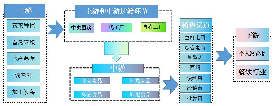 预制菜上游是预制菜的原材料来源及其加工设备,其中预制菜原材料来源主要是前端的蔬菜种植、畜禽养殖、调味料和水产养殖等行业;预制菜相关设备主要包括:洁净设备、储存设备和包装设备等。