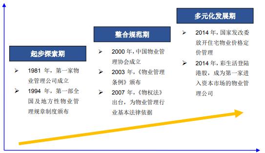 20世纪80年代初,随着我国改革开放的国策实施,物业管理由香港引入深圳。深圳作为公认的境内物业管理的发源地,是行业的先行人和推动者,在行业的发展历程中创造了多个第一:1981年3月10日,深圳市第一家涉外商品房管理的专业公司——深圳物业管理公司正式成立,开始对深圳经济特区的涉外商品房实行统一的物业管理,标志着国内物业管理行业的诞生;1993年6月28日,深圳成立了国内第一家物业管理协会——深圳市物业管理行业协会;1994年,深圳市颁布了我国第一部地方性物业管理法规《深圳经济特区住宅区物业管理条例》。从深圳成立第一家物业管理公司开始,我国物业管理行业经历了起步探索期,整合规范期和多元化发展期三个阶段,具体如下图所示: