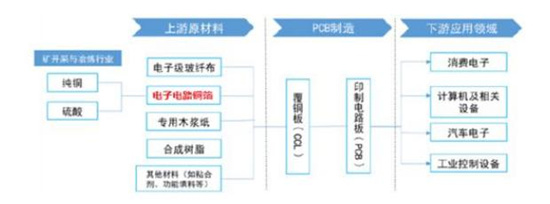 电子电路铜箔位于 PCB 产业链的上游,电子电路铜箔与电子级玻纤布、专用木浆纸、合成树脂及其他材料(如黏合剂、功能填料等)等原材料经制备形成覆铜板(CCL),再经过一系列其他复杂工艺形成印制电路板(PCB),被广泛应用于通信、消费电子、计算机及相关设备、汽车电子和工业控制设备产品中。电子电路铜箔的主要原材料为阴极铜加工成的铜线,更上游为铜矿开采与冶炼行业。