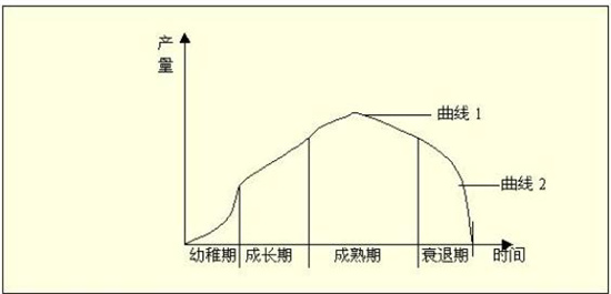 行业的生命周期曲线忽略了具体的产品型号、质量、规格等差异,仅仅从整个行业的角度考虑问题。行业生命周期可以从成熟期划为成熟前期和成熟后期。在成熟前期,几乎所有行业都具有类似S形的生长曲线,而在成熟后期则大致分为两种类型:第一种类型是行业长期处于成熟期,从而形成稳定型的行业,如图中右上方的曲线1;第二种类型是行业较快的进入衰退期,从而形成迅速衰退的行业,如图中的曲线2。行业生命周期是一种定性的理论,行业生命周期曲线是一条近似的假设曲线。
