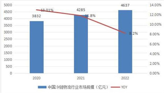 在市场和政策的双向驱动下,我国的冷链物流市场规模快速增长,2022年,冷链物流市场规模达到4637亿元,同比提高了8.2%。