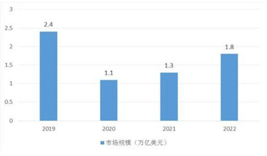 图表:2019-2022年全球文化产业市场规模(单位:万亿美元)