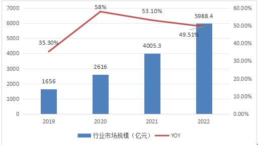 在政策支持、新兴技术逐渐成熟的大背景下,我国汽车行业智能化、网联化进程加速,带动产业链上下游不断升级,参与玩家持续增加,行业规模迎来高速增长。赛迪顾问数据显示,智能网联汽车行业规模从2019年的1656亿元增长至2022年的5988.4亿元,年复合增长率超53%。