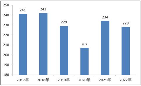 在我国电线电缆出口市场方面,随着全球市场的持续增长,我国行业领先企业逐步开始重视国外市场的开发,凭借出色的产品质量和性价比优势,2017-2022年电线电缆行业出口量一直稳定在220万吨以上。