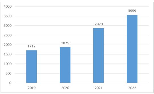 图表:2019-2022年中国新能源汽车零部件行业市场规模(单位:亿元)
