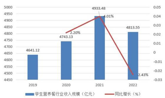 中国学生营养餐具备稳定的客户群体,2022年全国在校生约有2.507亿人。随着学生营养餐多样化发展和行业服务、技术的升级,学生营养餐行业收入规模将有所增长,2022年学生营养餐行业收入规模为4813.55亿元,同比增长-2.43%。