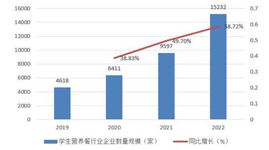 国内学生营养餐行业企业统计划分较为模糊,目前还没法从工商部门网站查询到,也较难去统计。从团膳网统计数据来看,截止2022年底,国内共有团餐企业55593家,在团餐行业中,学生营养餐占比估算约为27.4%,从而估算2022年学生营养餐行业企业数量约为15232家