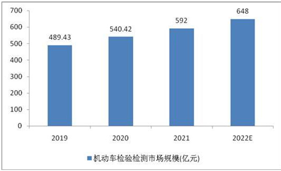 随着我国二手车市场的快速发展,以及消费者对汽车安全性的认知持续提高,我国非强制性车检的市场规模也会持续扩容,新车下线检测市场也会随着每年新车上线数量增加而扩大。近年来,我国汽车检测行业的市场规模一直保持增长的趋势,从2019年的489.43亿元增加到2021年592亿元,预计到2022年将达到648亿元。