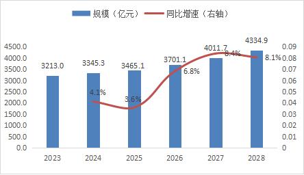 根据中研研究院《2023-2028年中国互联网金融行业市场前景预测及投融资战略报告》分析得知,根据行业景气度等指标综合分析,预计2023-2028年互联网保险保费规模呈现逐年增长趋势,2028年保费规模为4334.9亿元,同比增长8.1%。