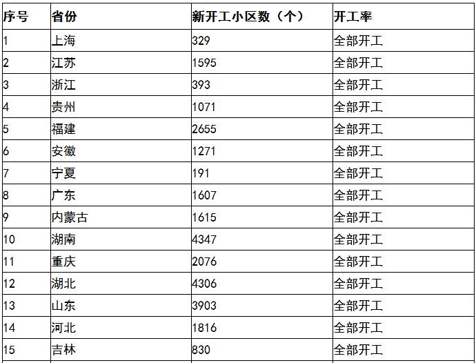 2023年,全国计划新开工旧城改造老旧小区5.3万个、涉及居民865万户。根据各地统计上报数据,1-9月份,全国新开工改造城镇老旧小区5.13万个、惠及居民851万户,按小区数计开工率97%。分省看,上海、江苏、浙江、贵州、福建、安徽、宁夏、广东、内蒙古、湖南、重庆、湖北、山东、河北、吉林、江西、海南、云南、陕西、青海、新疆等21个省份全部开工。