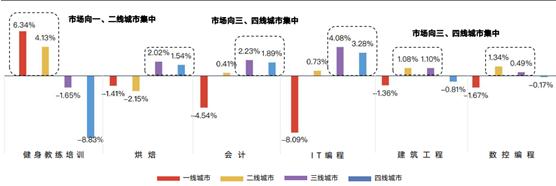 健身教练培训需求在高线城市相对更加突出烹饪、会计、IT培训等行业,一、二线城市已趋于成熟,三、四线城市机会增多二、三线城市处于经济快速发展区域,建筑工程和数控编程在二、三线城市的发展态势较好。
