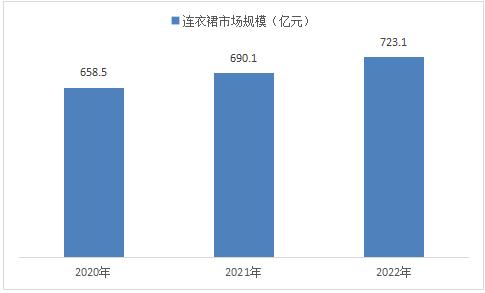 2020年,连衣裙行业市场规模为658.5亿元,2021年,连衣裙行业市场规模为690.1亿元,2022年,连衣裙行业市场规模为723.1亿元。