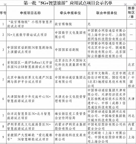 5G+智慧旅游行业前景及现状如何?未来5G+智慧旅游市场投资趋势怎么样?据文旅部网站11月10日消息,根据《文化和旅游部办公厅 工业和信息化部办公厅关于组织开展“5G+智慧旅游”应用试点项目申报工作的通知》(办资源发〔2023〕145号),在相关部门推荐和企事业单位自愿申报的基础上,经专家评审,文化和旅游部、工业和信息化部拟确定第一批“5G+智慧旅游”应用试点项目,现予以公示。