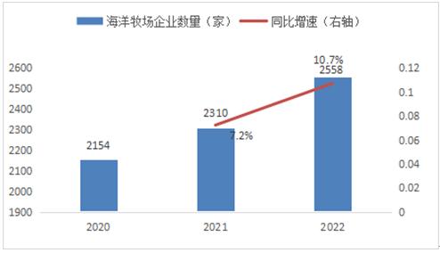 根据市场调研数据分析,中国海洋牧场企业呈现逐年增长趋势,海洋牧场企业数量为2558家,同比增长10.7%。