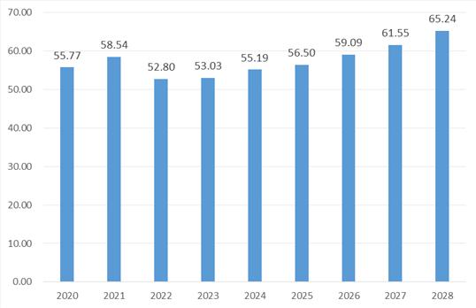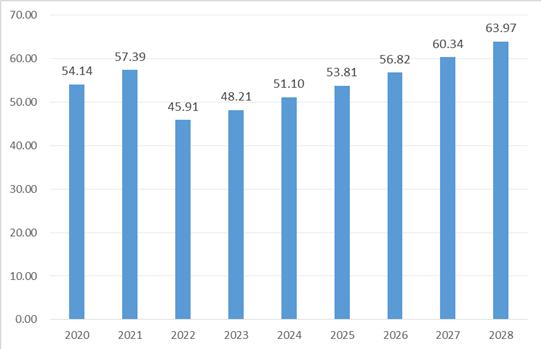 图表:2020-2028年俄罗斯汽车发动机零部件市场规模及预测(亿美元)