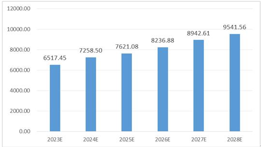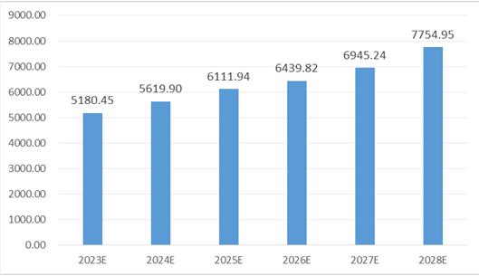 图表:2023-2028年中国商业综合体产值规模预测(亿元)