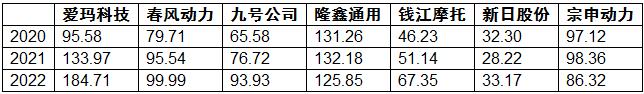 图表:2020-2022年我国电动摩托车企业营业收入对比(单位:亿元)