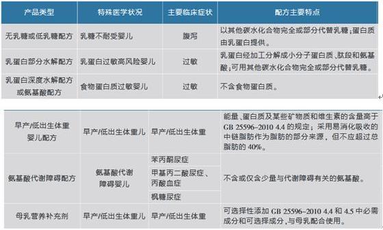 根据《食品安全国家标准特殊医学用途婴儿配方食品通则》(GB25596-2010),我国特殊医学用途婴儿配方食品包括为6类,产品类别、适用特殊医学状况、主要临床症状、配方主要特点情况如下表: