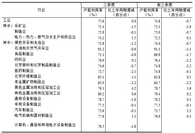 分主要行业看,三季度,煤炭开采和洗选业产能利用率为73.8%,食品制造业为71.1%,纺织业为76.9%,化学原料和化学制品制造业为74.6%,非金属矿物制品业为65.0%,黑色金属冶炼和压延加工业为79.1%,有色金属冶炼和压延加工业为80.2%,通用设备制造业为78.7%,专用设备制造业为77.5%,汽车制造业为75.6%,电气机械和器材制造业为77.8%,计算机、通信和其他电子设备制造业为76.5%。
