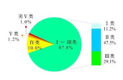 1—6月,3641个国家地表水考核断面中,水质优良(Ⅰ—Ⅲ类)断面比例为87.8%,同比上升2.1个百分点;劣Ⅴ类断面比例为1.0%,同比下降0.1个百分点。主要污染指标为化学需氧量、高锰酸盐指数和总磷。