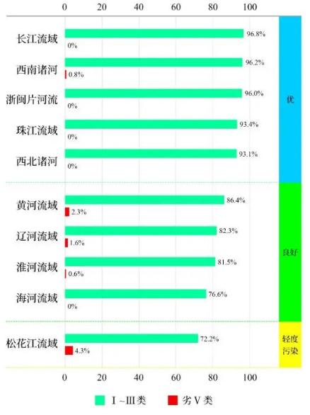 第二季度,长江、黄河、珠江、松花江、淮河、海河、辽河等七大流域及西北诸河、西南诸河和浙闽片河流水质优良(Ⅰ—Ⅲ类)断面比例为85.3%,同比上升1.2个百分点;劣Ⅴ类断面比例为0.8%,同比下降0.1个百分点。主要污染指标为化学需氧量、高锰酸盐指数和五日生化需氧量。其中,西南诸河、长江流域、浙闽片河流和西北诸河水质为优;珠江和黄河流域水质良好;辽河、淮河、海河和松花江流域为轻度污染。