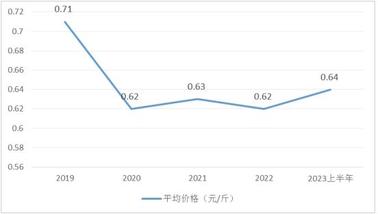 2020年,中国甘蔗产量为10832.22万吨。到了2022年,中国的甘蔗产量下滑明显,仅为10363.61万吨。2020年至2023上半年期间,甘蔗的价格走势呈现不景气的趋势,价格很难涨上去。