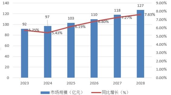 图表:2023-2028年天然电气石板行业市场规模及增速预测