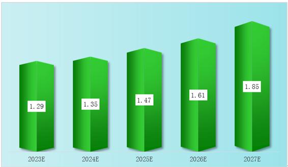图表:2023-2027年我国工程质量检测出具报告供给预测(单位:亿份)
