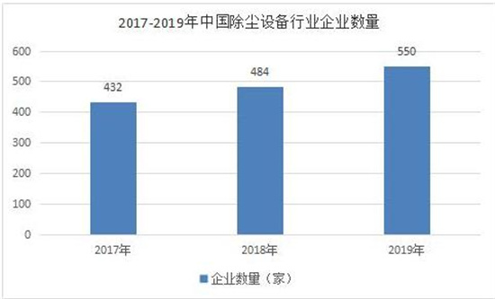 据数据显示,2017年中国除尘设备行业企业数量为432家,2018年中国除尘设备行业企业数量为484家,2019年中国除尘设备行业企业数量为550家,同比2018年增长65家。