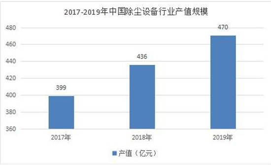 据数据显示,2017年中国除尘设备行业产值规模为399亿元,2018年中国除尘设备行业产值规模为436亿元,2019年中国除尘设备行业产值规模为470亿元,同比增速为7.95%。