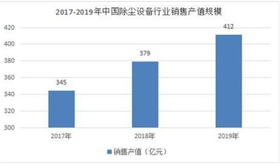 据数据显示,2017年中国除尘设备行业销售产值规模为345亿元,2018年中国除尘设备行业销售产值规模为379亿元,2019年中国除尘设备行业销售产值规模为412亿元,同比增速为8.47%。