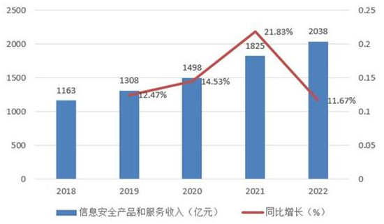 信息安全产业是支撑和保障国家信息安全的重要基础,肩负着为国家信息化基础设施和信息系统安全保障提供安全产品及服务的战略任务。传统的依赖于边界防御的静态安全控制措施将逐渐被基于大数据分析的高级、智能安全手段所取代。据工信部数据,2022年,信息安全产品和服务收入2038亿元,同比增长10.4%。