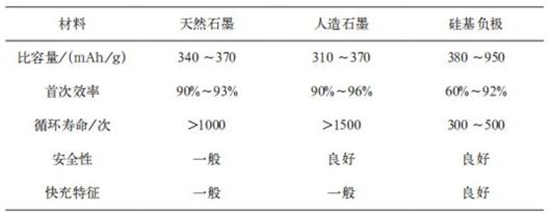 图表:常用石墨系负极材料与硅基负极材料的性能对比